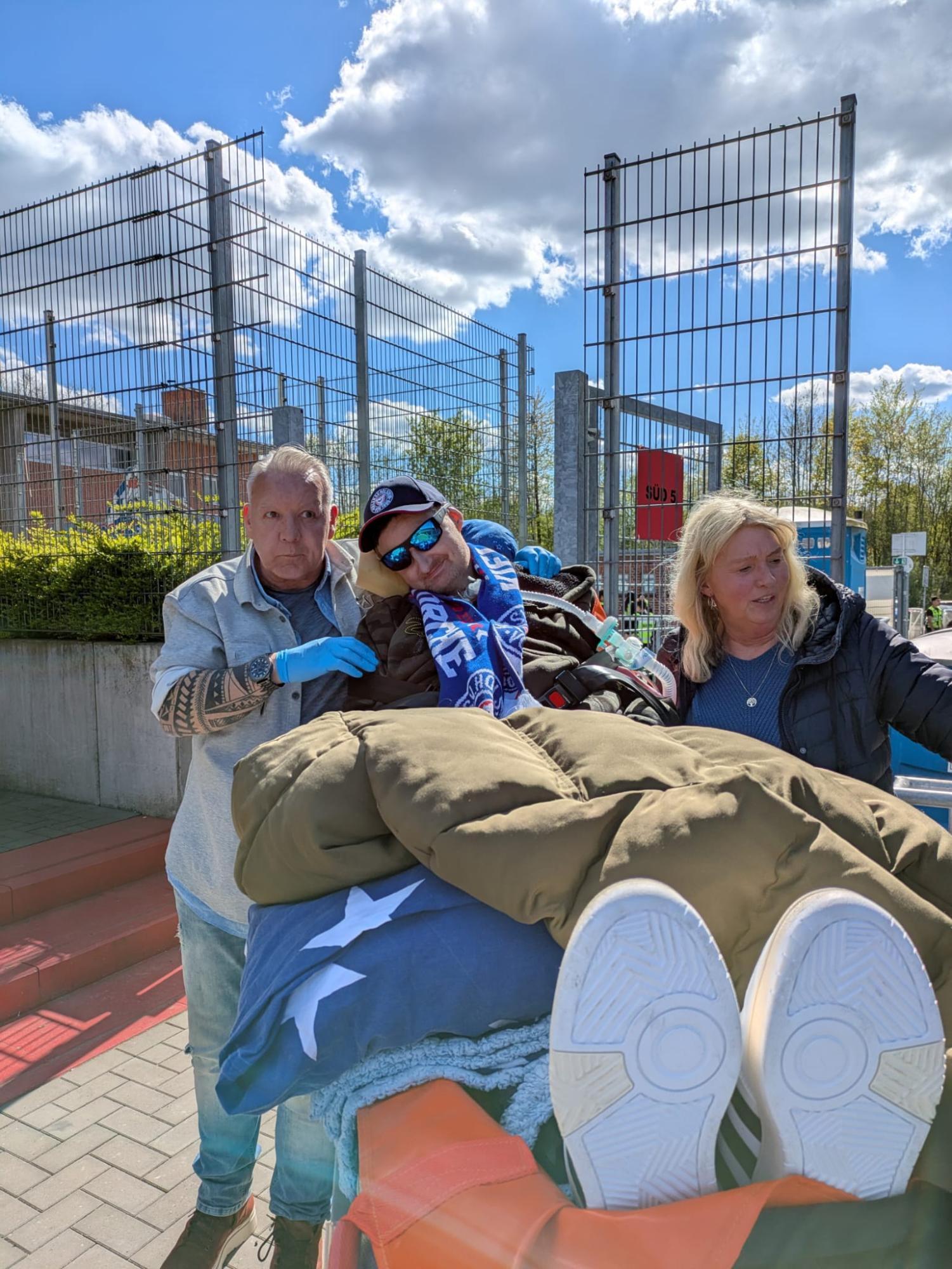Gemeinsam mit seinem Pfleger Arne und seiner Mutter machte sich Dennis am Samstag pünktlich mit dem ASB-Wünschwagen auf den Wegins Holstein-Stadion. Der Integrationsbeauftragte der Stadt hatte im Vorfeld alles perfekt organisiert: Ein Platz direkt an der Eckfahne wurde für Dennis vorbereitet – mit freiem Blick auf das Spielfeld, umgeben vom Jubel der Fans und begleitet vom wärmenden Sonnenschein.
