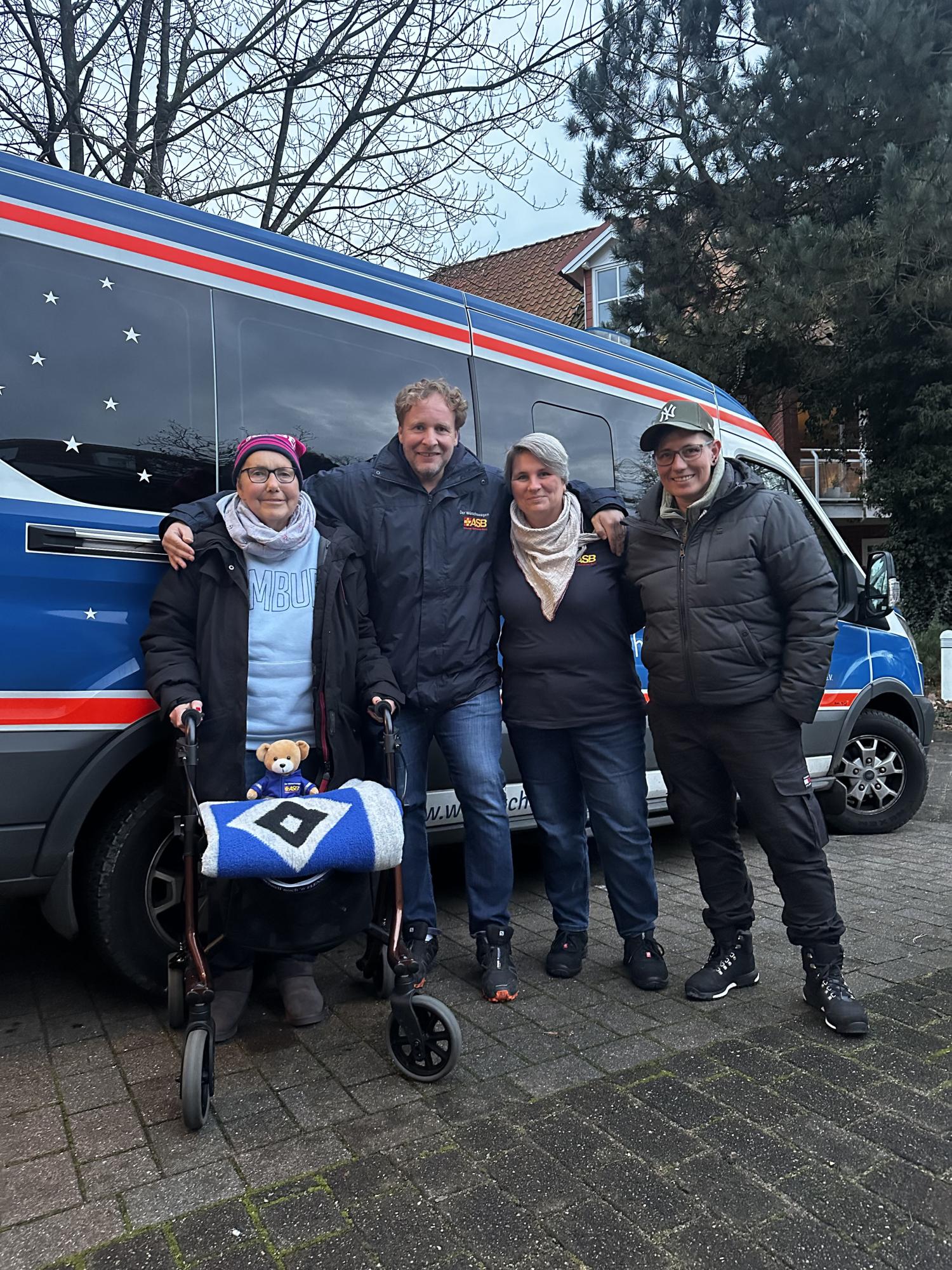 Diesen Wunsch hatte Conny auf dem Zettel. Ihre Tochter Mella kontaktierte das Wünschewagen-Team. Wie es der Zufall wollte, stand das Auswärtsspiel gegen Holstein Kiel am 11. November auf dem Spielplan des HSV – nicht weit entfernt also von dem Hospiz Haus Porsefeld in Rendsburg, in dem Conny wohnt. Von dort starteten die Wunscherfüller:in Manuela und Lars gemeinsam mit Conny und ihrer Tochter Mella in Richtung „Kieler Störche“. Conny hatte sich mit ihrer HSV-Fankluft so richtig in Schale geworfen, und ein kleines Spalier entließ sie aus dem Hospiz.